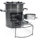 The stove supports multiple fuel types, including wood, charcoal, and biomass, offering flexibility depending on availability. Its insulated barrel design helps maintain consistent heat output, making it suitable for preparing a variety of meals outdoors.